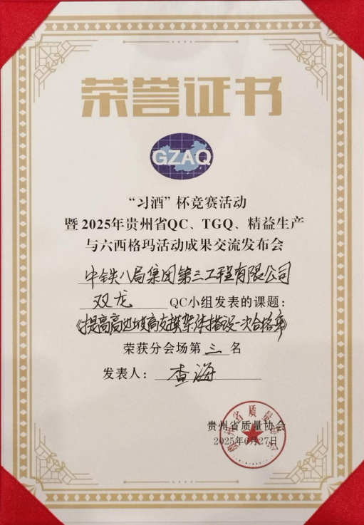 经过激烈角逐与严格评审,由公司贵州双龙产业园项目申报的《提高高边坡高支模架体搭设一次合格率》QC成果,凭借独特的项目创新性、严谨的数据支撑、突出的经济效益及行业示范价值,从众多优秀成果中脱颖而出,荣获第七分会场第三名。