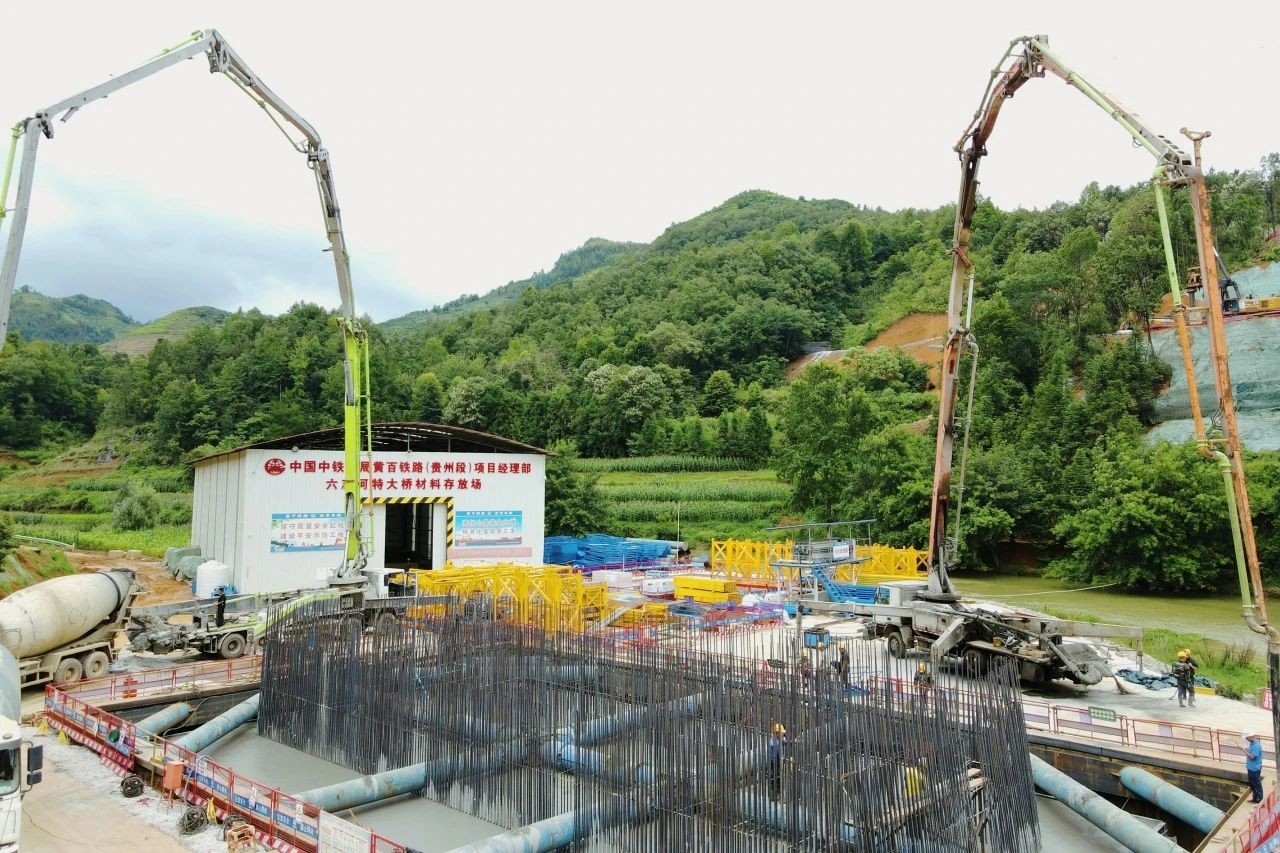 六志河特大桥位于贵州省安顺市镇宁县本寨镇,是黄百铁路贵州段重难点工程。全桥共设30个墩台,桥址区地质条件异常复杂,以强烈发育的岩溶地貌为主,夹杂软黏土等特殊岩土,给基础施工带来多重挑战。其中,18号墩高117米,为黄百铁路贵州段最高墩之一;其承台需浇筑1872立方米混凝土,属于典型的高难度大体积混凝土工程,技术标准高、施工管控要求严。