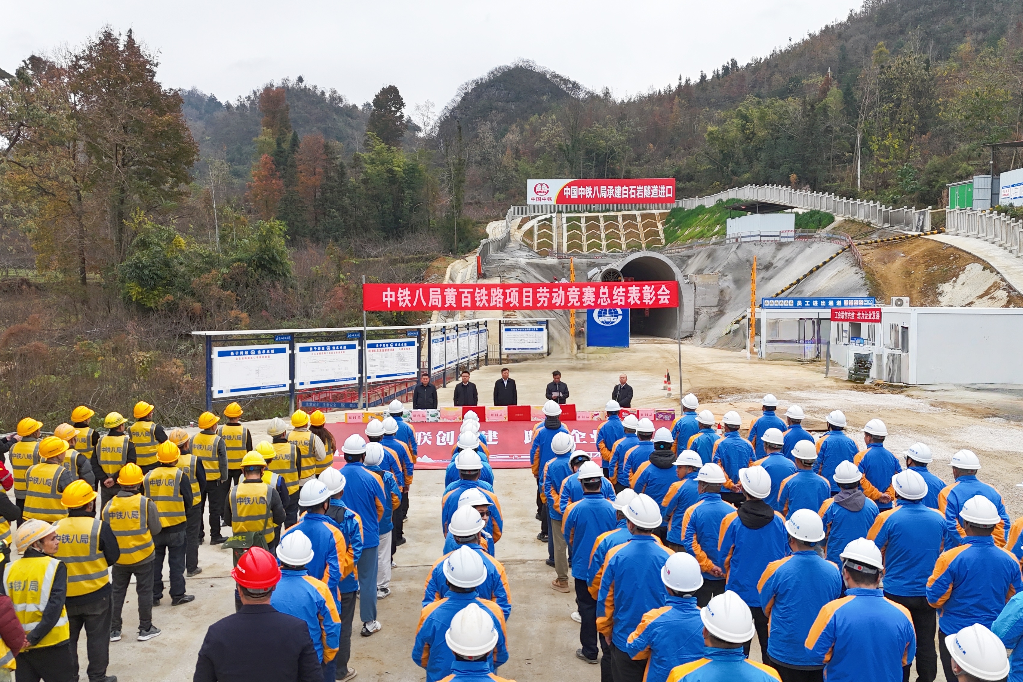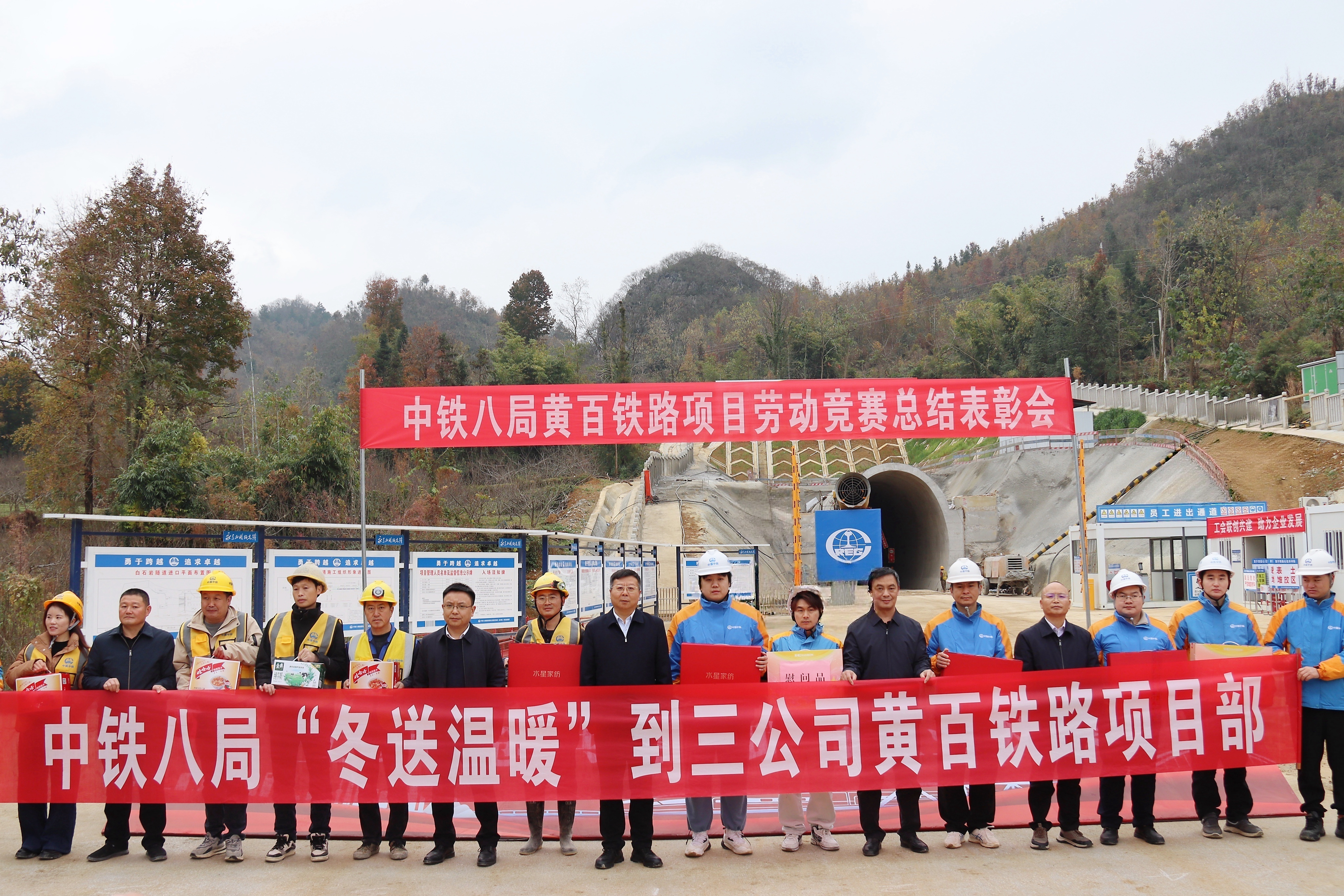 12月25日,由集团公司工会主办、公司工会承办的“比学赶超 建功黄百”劳动竞赛总结表彰大会在黄百铁路白石岩隧道进口隆重举行,标志着此次劳动竞赛圆满收官。集团公司党委常委、纪委书记李家标,集团公司工会副主席邓双波,公司党委书记、董事长曹火勇,副总经理付成开出席表彰大会。大会由公司副总经理、工会主席康健主持。
