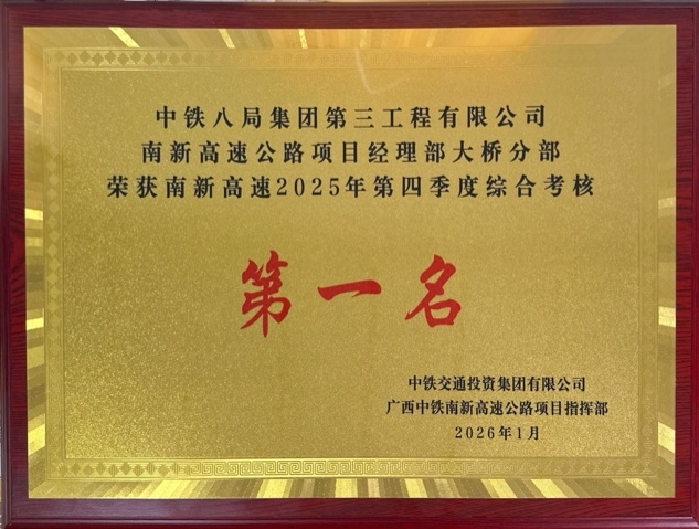 近日,南新高速公路项目部大桥分部在广西中铁南新高速公路项目指挥部2025年四季度综合考核评比中荣获全线第一名。