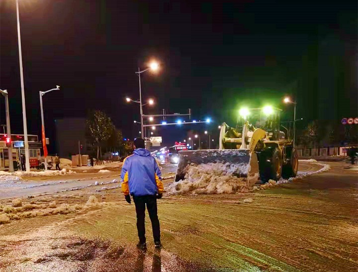 11月7日,河北省沧州市迎来了2021年第一场暴雪天气,沧州市区的道路上到处是积雪,路面积雪厚度达0.2米,交通受阻,严重影响了市民的出行。为方便市民出行,减少交通事故发生,公司沧州项目部迅速组织党员和青年团员30余人、5台铲车成立志愿队参与到除冰铲雪志愿服务工作中。