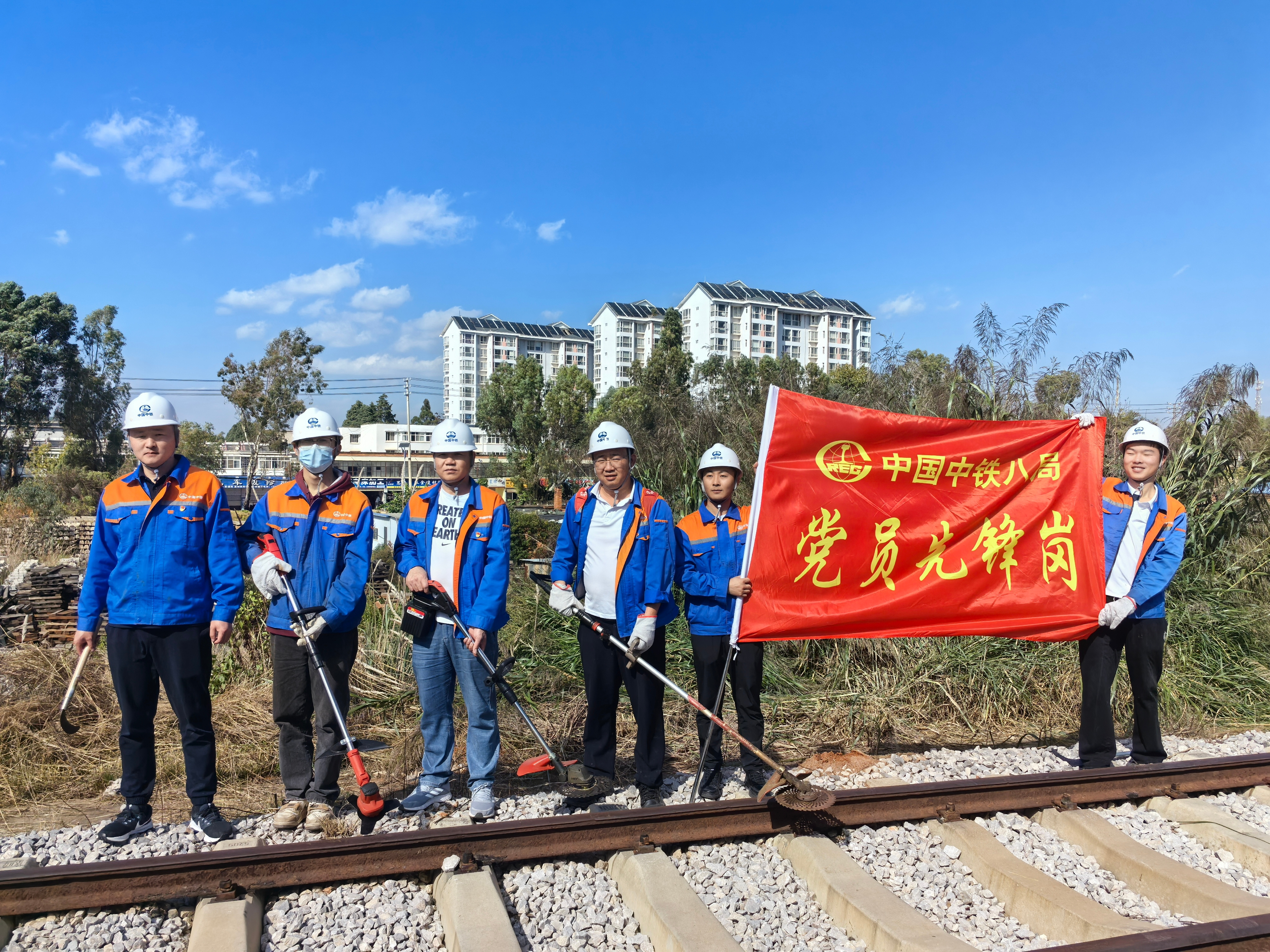 昆明轨枕公司铁路专用线是连接厂区与国家铁路干线的核心通道,承担着原材料运入、产成品发出的关键任务,是保障七公司生产经营的“生命线”。行动当日,党员突击队队员身着统一工装,携带割草机、镰刀、锄头等工具准时集结。在党支部书记统筹调度与队长现场指挥下,队员们沿铁路专用线两侧分工协作、有序推进,用操作割草机对大面积杂草集中切割,高效攻克“重难点区域”,手持镰刀、锄头清理机械无法触及的边角缝隙,确保“不留死角盲区”,保障现场安全整洁。