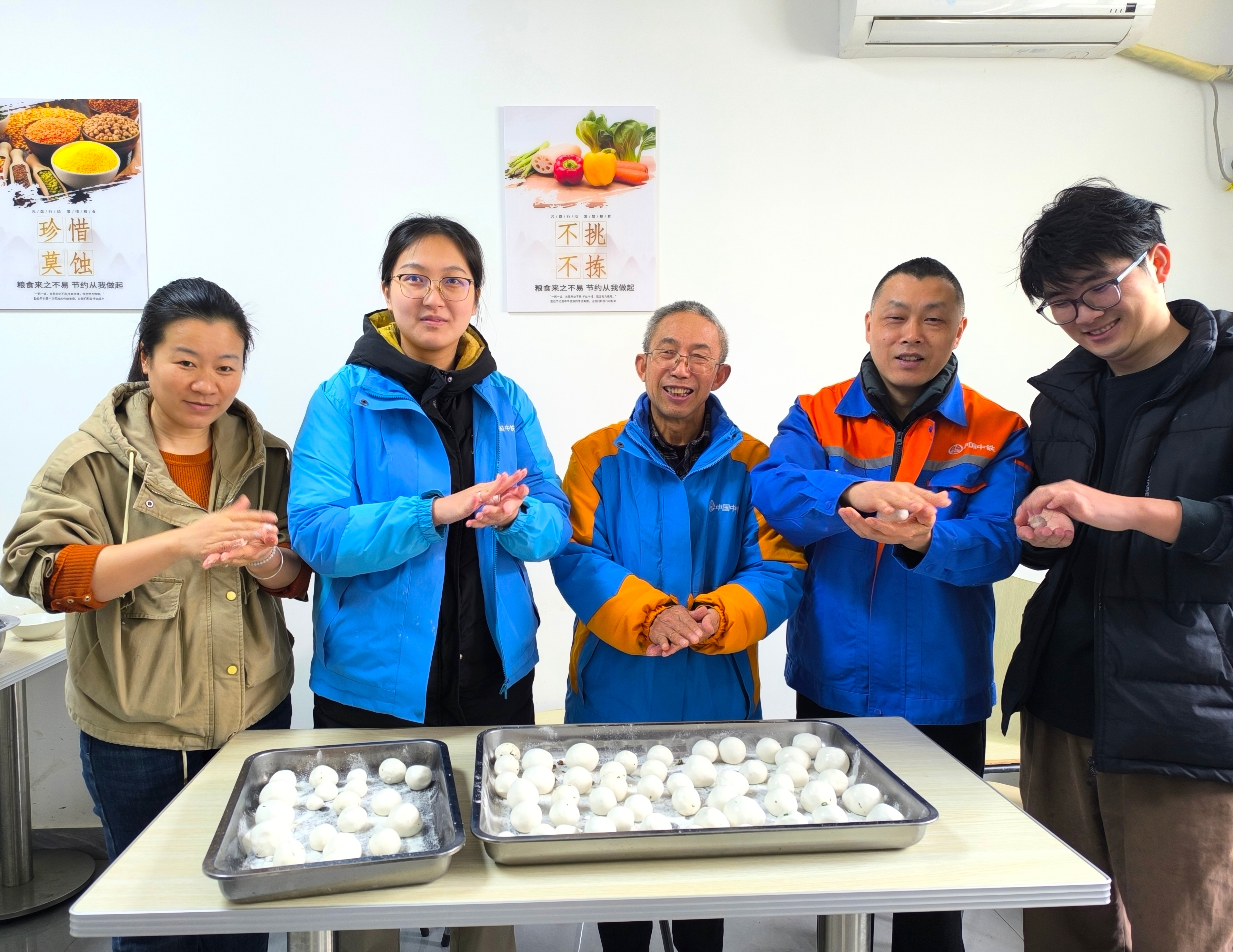 活动现场,糯米粉、酱肉馅、海带骨汤等食材整齐摆放,大家分工协作、默契配合。达州本地的同事主动当起了老师,从揉面、捏皮到包馅、搓圆,动作娴熟流畅;青年职工们认真学习、大胆尝试,一个个大小不一、形状各异的肉汤圆很快摆满托盘。