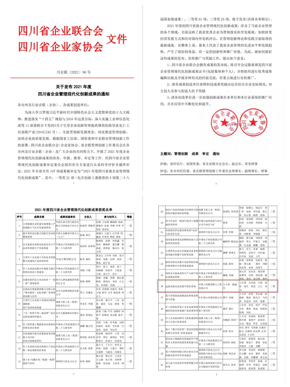公司一科技成果荣获2021年度四川省企业管理现代化创新成果二等奖