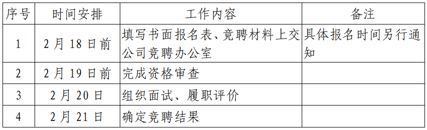 此次公开竞聘按照填写报名表→资格审查→面试、履职评价→确定竞聘结果的程序进行。进度安排如下表: